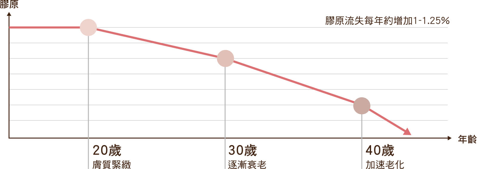 20歲起,膠原按年流失約1%,30歲,已流失膠原達10年!40歲後更會加劇流失。此外喜歡甜、常飲酒、懷孕、敎子女壓力、婚姻問題、更年期、內分泌失調、荷爾蒙失調、年齡增長、睡眠不足都會加速膠原流失,如未能及時補充膠原,會導致毛孔粗大、皺紋、鬆弛等衰老浮現,容易出現30變40特變老化,更會導致軟骨流失、靈活度減退。