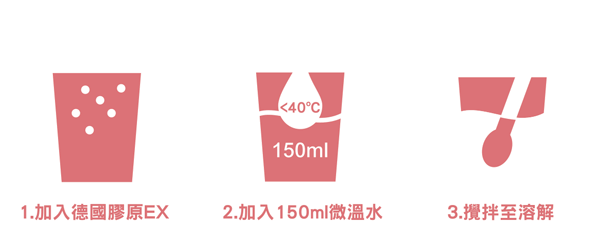 先把德國膠源EX倒進杯中,再加入約150毫升室溫凈水(30度以下),攪拌溶解後即可服用。避免熱水,電解水沖服。