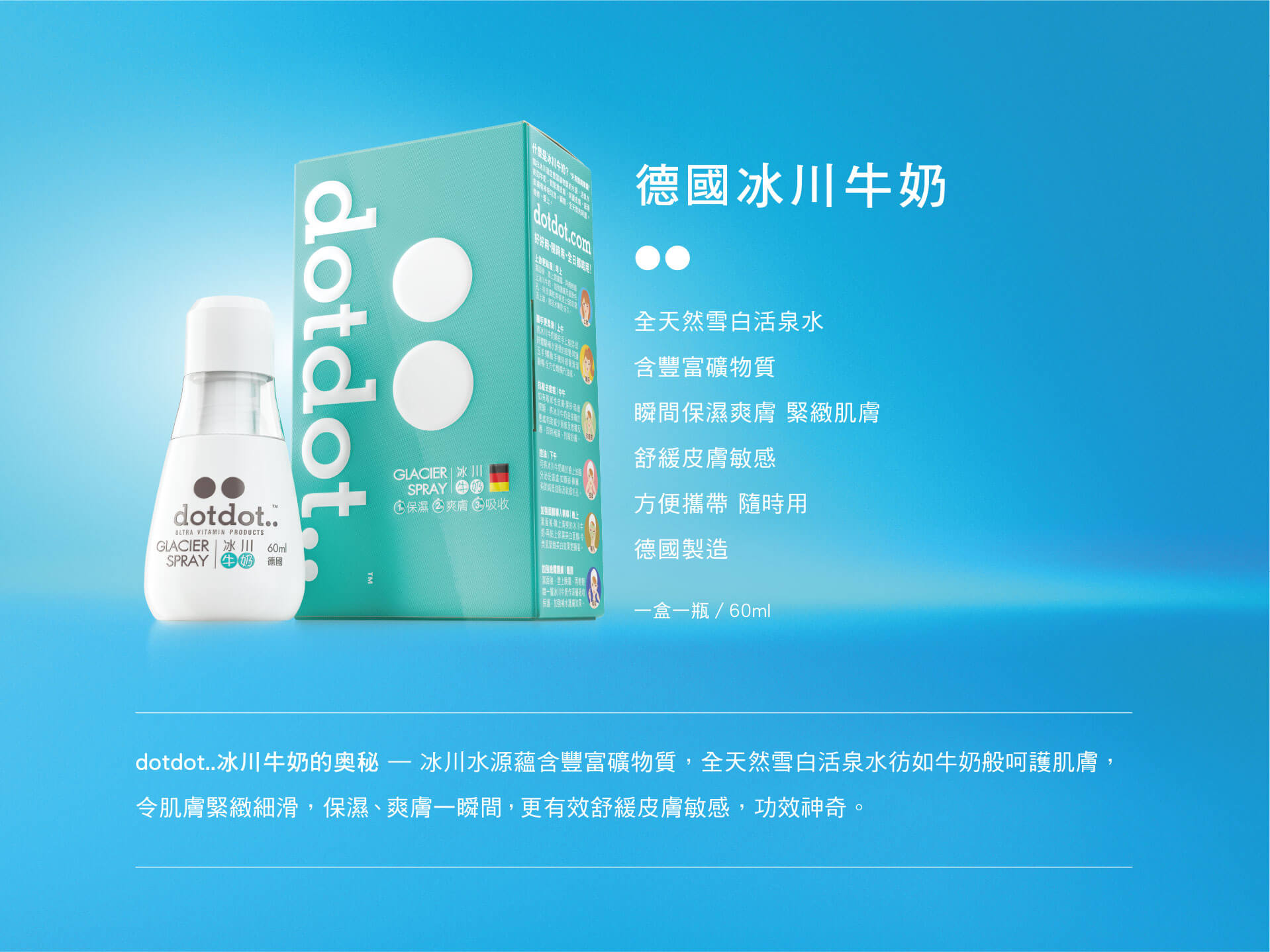 dotdot..冰川牛奶蘊含豐富礦物質,活泉水彷如牛奶,瞬間令肌膚緊緻細滑,功效神奇。細緻水分子噴霧,能滲透肌底,強效補水,及有效舒緩皮膚敏感。包裝方便攜帶,讓你時刻擁有飽滿牛奶水嫩肌。