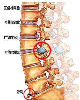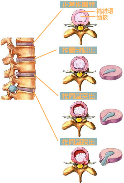 答:腰椎間盤突出症主要分膨隆型、突出型、脫垂游離型、Schmorl結節及經骨突出型。
